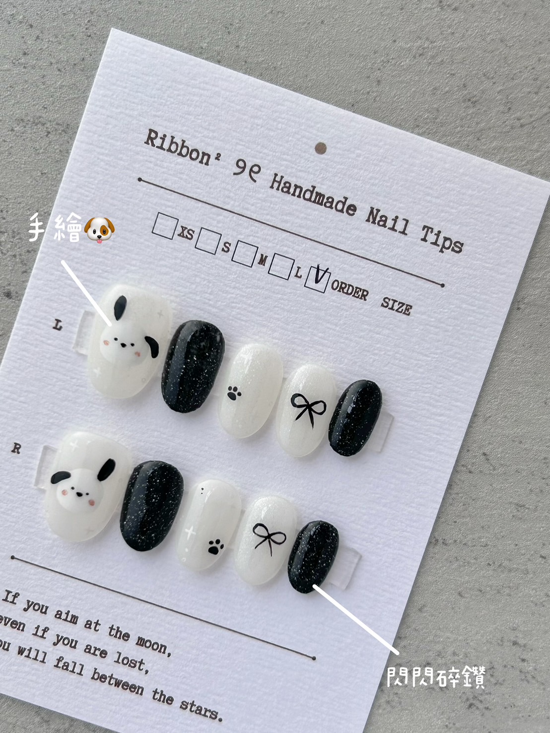 手繪狗狗 x 黑碎鑽 x 手繪蝴蝶結與腳印